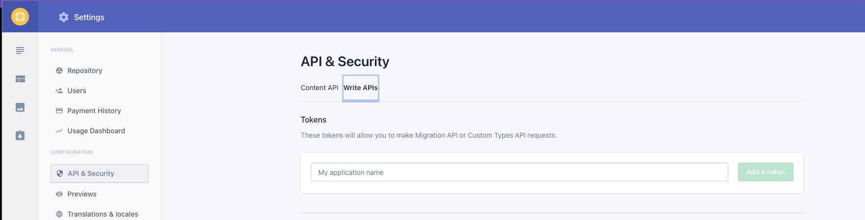 Admins can go to /settings/apps to create a permanent token that works for both of our write APIs, the Custom Types API and Migration API.