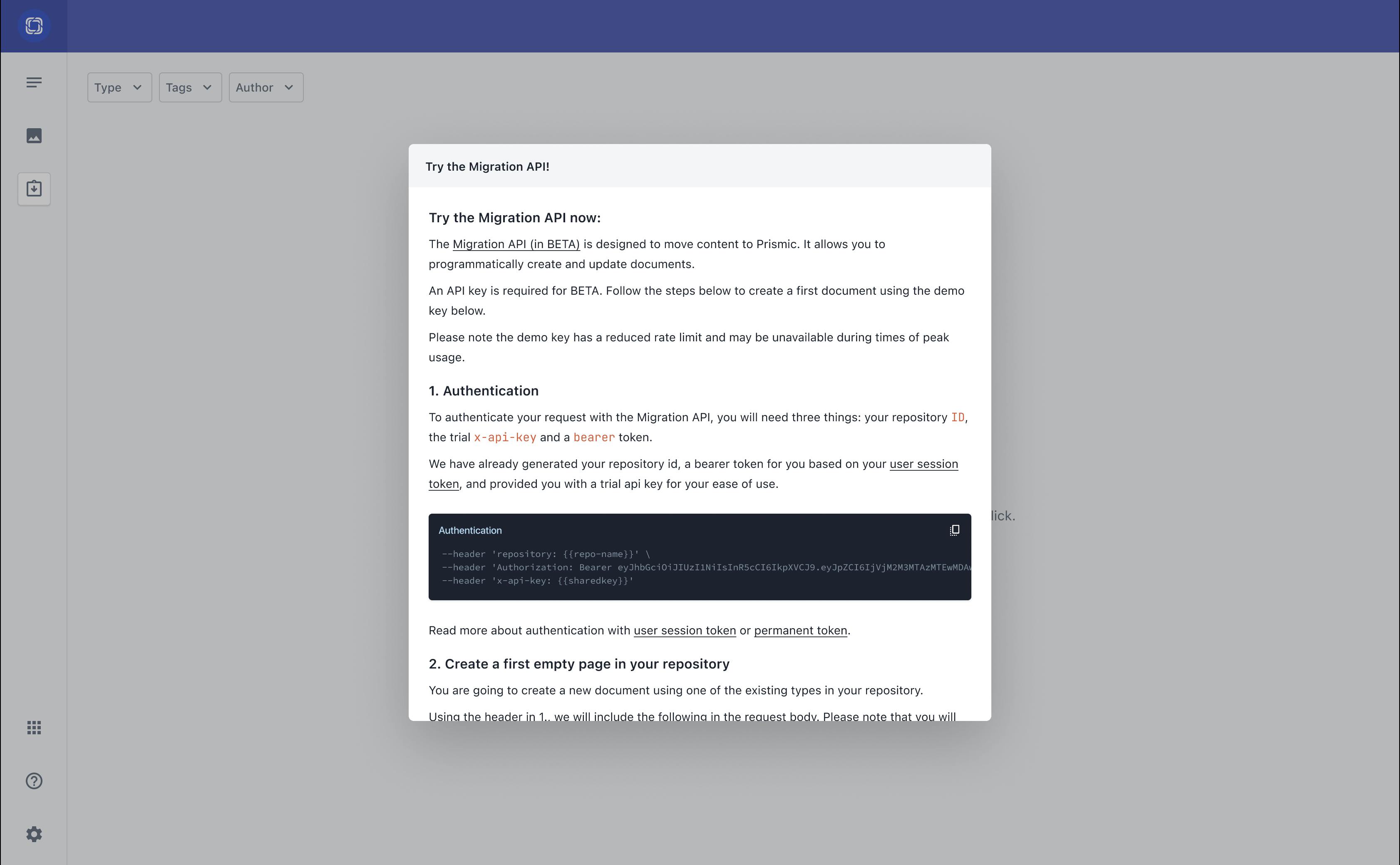 Users who want to try out the Migration API Beta can follow step-by-step instructions to make their first POST request via the "Migration Releases" navigation item. This request is made via a shared key, and we are clearly positioning it as a demo key with limited availability.